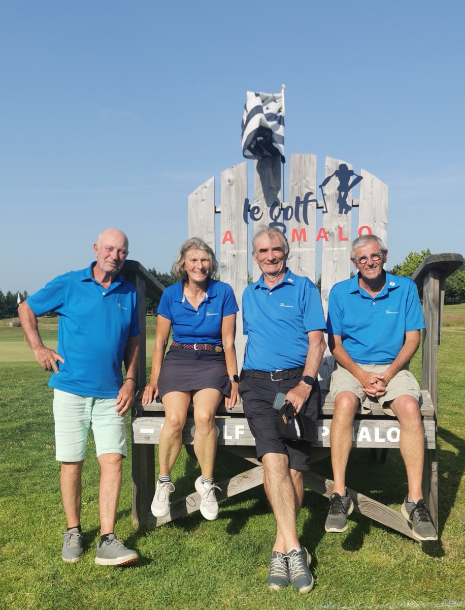 Mardi 10 et mercredi 11 juin se déroulait le premier tour du Championnat de Bretagne séniors des golfs neuf trous. 4 Joueurs le premier jour et 4 autres le second ont bataillé sur le parcours de Cap Malo, non loin de Rennes. La chaleur et des greens assassins ont perturbé nos joueurs. Nos résultats nous placent en bonne position pour le retour. En photo, les 4 joueurs du mercredi et la remise de prix à Rozenn pour sa pemière place en net chez les femmes.